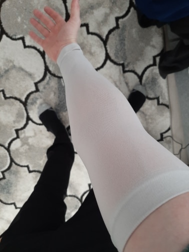 I sometimes use these at night because my arms are out from under the covers. These are stretchy and comfortable… not cutting off the blood supply. I’m not a small armed person either. The compression ones are just too darn uncomfortable for me. To be honest, I don’t think that someone who has big man guns would be totally comfortable. The stretch is pretty amazing, yet they have good and close cling coverage at the same time. Easy off and on when I have a task (ie, washing dishes) and need to remove them for a moment.