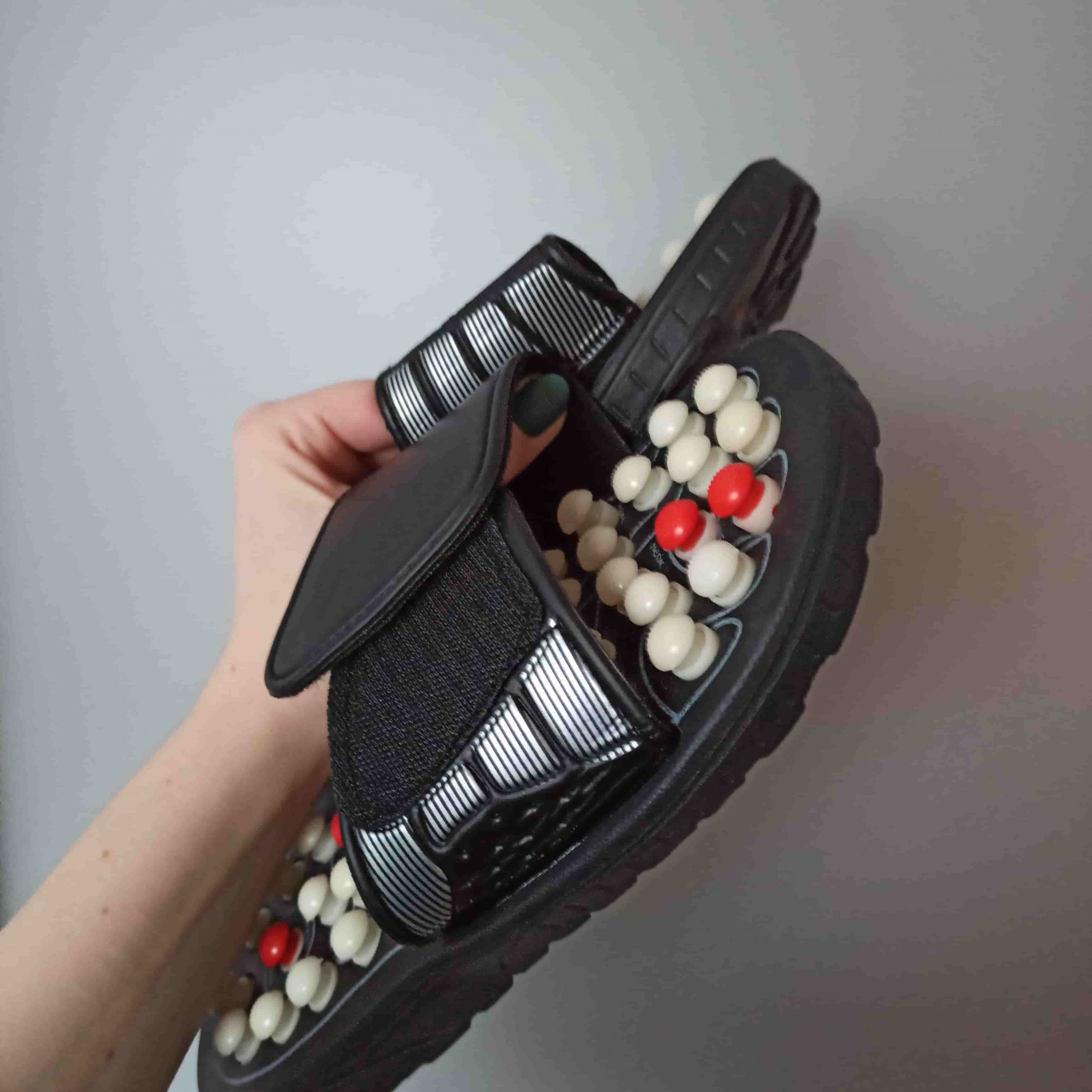 I debated which version (intensity level) to get, but am glad I purchased the most intense one. I was concerned when so many reviews said they were painful. With socks on, these were just right therapeutically. I like the jade stone accents. I wish they weren’t an ugly color, but they are to be worn in the home so that doesn’t really matter. I was concerned they wouldn’t fit my narrow feet, but with the adjustment it actually accommodates that enough which is great.