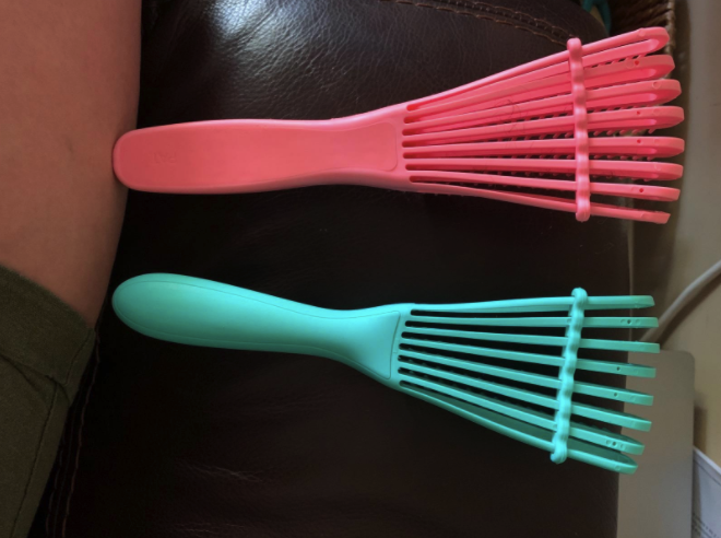 My daughter and I have SUPER curly hair. She’s 10 and learning to take care of it herself. She often doesn’t get conditioner worked all the way through, resulting in a tangled mess. I ordered this 2 pack so she’d have one brush in the shower (to brush the conditioner through) and one for when she got out so I could make sure she got all the tangles out. We used it last night and it worked PERFECT! I love he fact that it’s plastic so I can clean it easily and that it’s curved. Highly recommend!!!